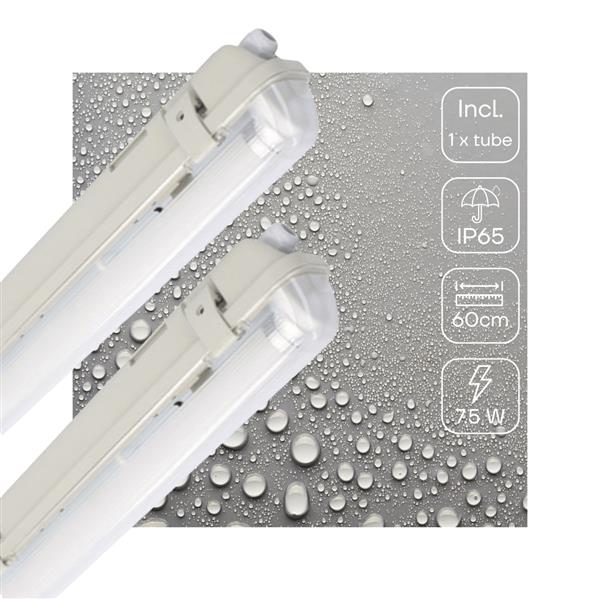 Dit armatuur is gehuld in een stevige polycarbonaat behuizing en beschikt over de nodige beschermingsgradaties. Zo is hij onder meer stofdicht en bestand tegen waterstralen (IP65), waardoor je hem zonder aarzeling in vochtige ruimtes en zelfs buiten kunt plaatsen. Bovendien zijn deze armaturen bestand tegen stoten dankzij de IK08-normering.