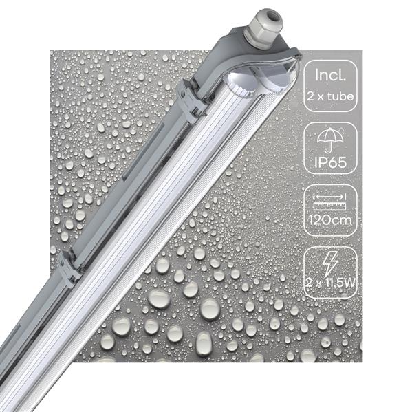 Dit LED TL-armatuur is stof- en waterbestendig (IP65), waardoor het geschikt is voor gebruik in omgevingen waar vocht en stof aanwezig zijn, zoals garages en magazijnen. De behuizing is gemaakt van slagvast polycarbonaat (IK08) voor extra duurzaamheid, zodat het armatuur lang meegaat.