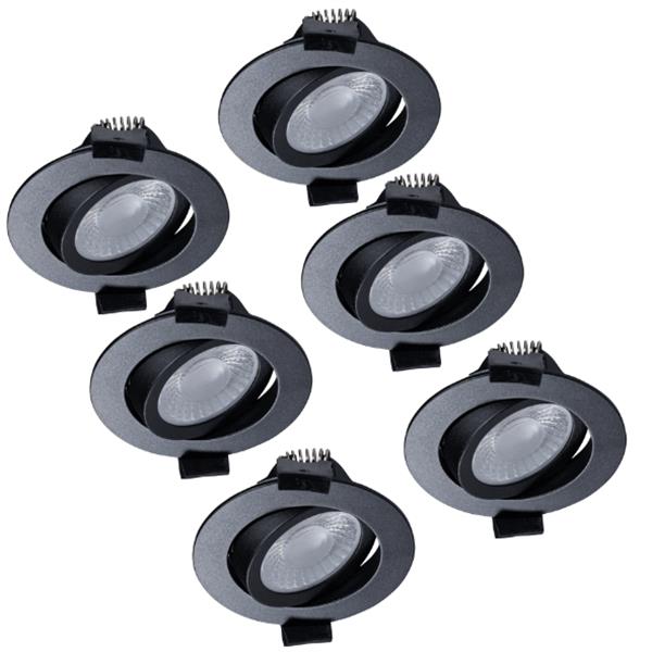 Met IP54-classificatie zijn deze inbouwspots spatwaterdicht en geschikt voor vochtige ruimtes zoals badkamers, keukens en overkappingen. De kantelbare uitvoering laat je de lichtbundel tot 30 graden kantelen om objecten of zones gericht te verlichten. De zwarte aluminium behuizing met mat afgewerkte diffuser van polycarbonaat geeft een moderne, strakke uitstraling. De spots hebben een diameter van 82mm en een inbouwhoogte van slechts 27mm, waardoor ze geschikt zijn voor plafonds met beperkte inbouwdiepte.
