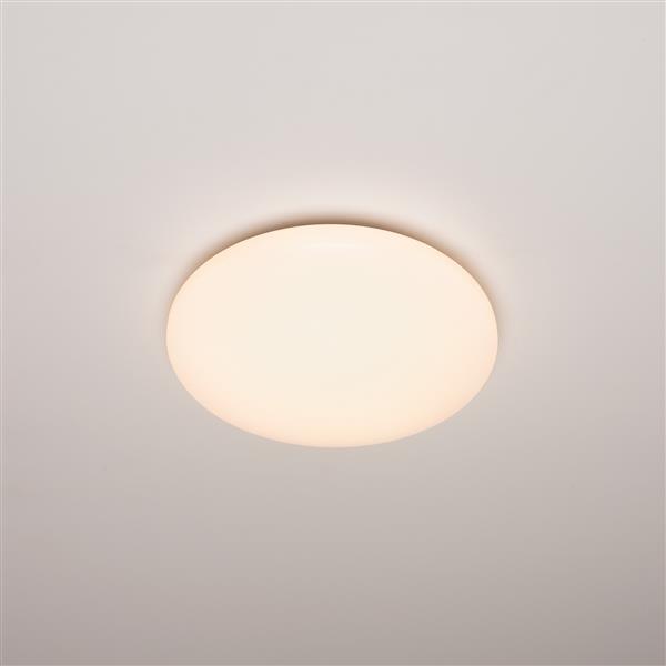 Soort verlichting: Plafond- en wandverlichting Afmetingen: Diameter van 27 cm - hoogte van 7.6 cm Totale lumenstroom: 1100 lumen Kleurtemperatuur: 3000 K Kleuromschrijving: warm wit Energieklasse: A++ Wattage: 12 watt (vervangt 77W) Levensduur: 25.000 branduren (2 jaar garantie) Kleur behuizing: Opaal IP-waarde: IP44 - Spatwaterdicht Geschikt voor temperaturen tussen: - 20 en 40 °C Verpakkingsinhoud: 1 x Proventa Longlife LED plafondlamp ⌀ 27 cm - 1100 lm - 12W + Handleiding + Montage-accessoires